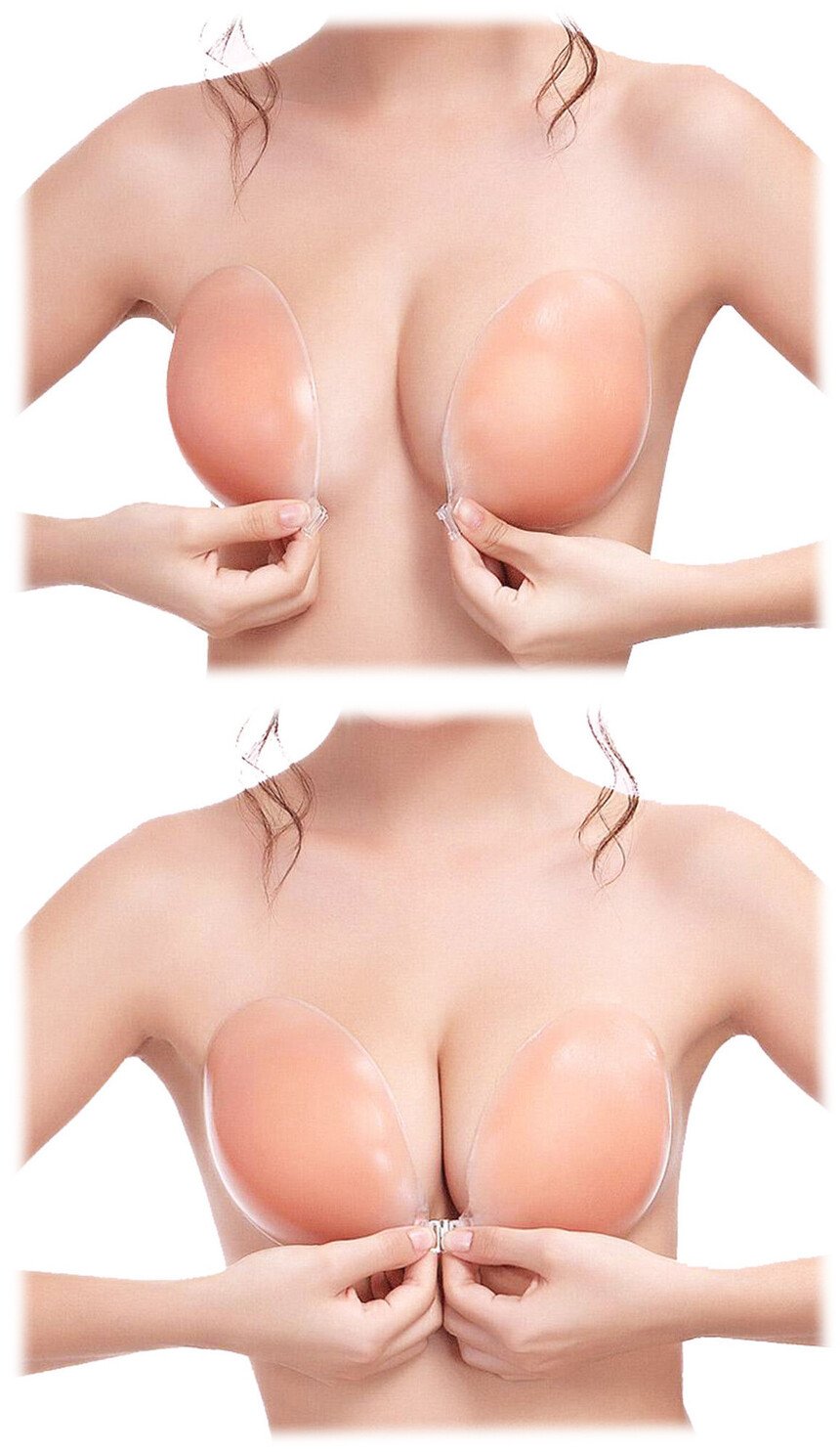 Приклейте силиконовые накладки на кожу на уровне сосков максимально далеко от центра груди и защёлкните замочек. Но имейте в виду, что если Вы разместите чашечки слишком далеко от центра груди, то не сможете их стянуть в дальнейшем. Если разместите их слишком близко, то не получите эффекта естественной ложбинки. Возможно придется поэкспериментировать, чтобы определить оптимальное место приклеивания накладок.