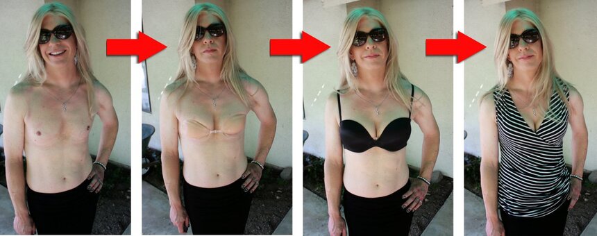 Перед началом преображения убедитесь, что на грудной клетке нет волос. В противном случае позднее процесс выхода из образа принесет несколько весьма неприятных минут, когда Вы будете отклеивать силиконовые накладки от тела.